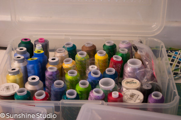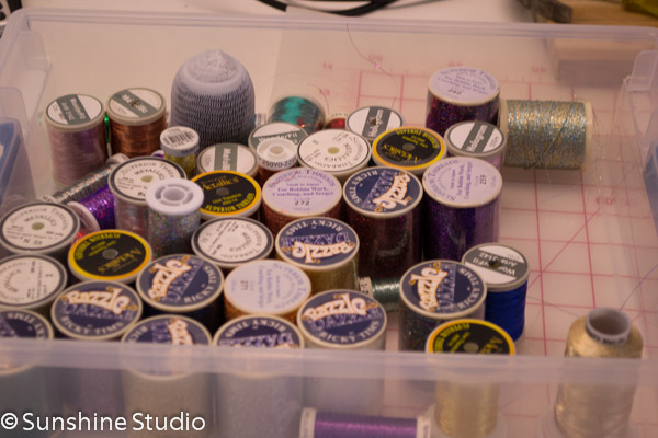 Thread, it comes very thin right up to very thick thread that you have to couch down or use in the bobbin. It comes sparkly, shiny or invisible. For anyone who loves to embellish their quilts, quilt quilts or do fibre art it is another item to collect. So for me as well as having a fabric stash and book stash I have a fairly extensive thread stash as well.